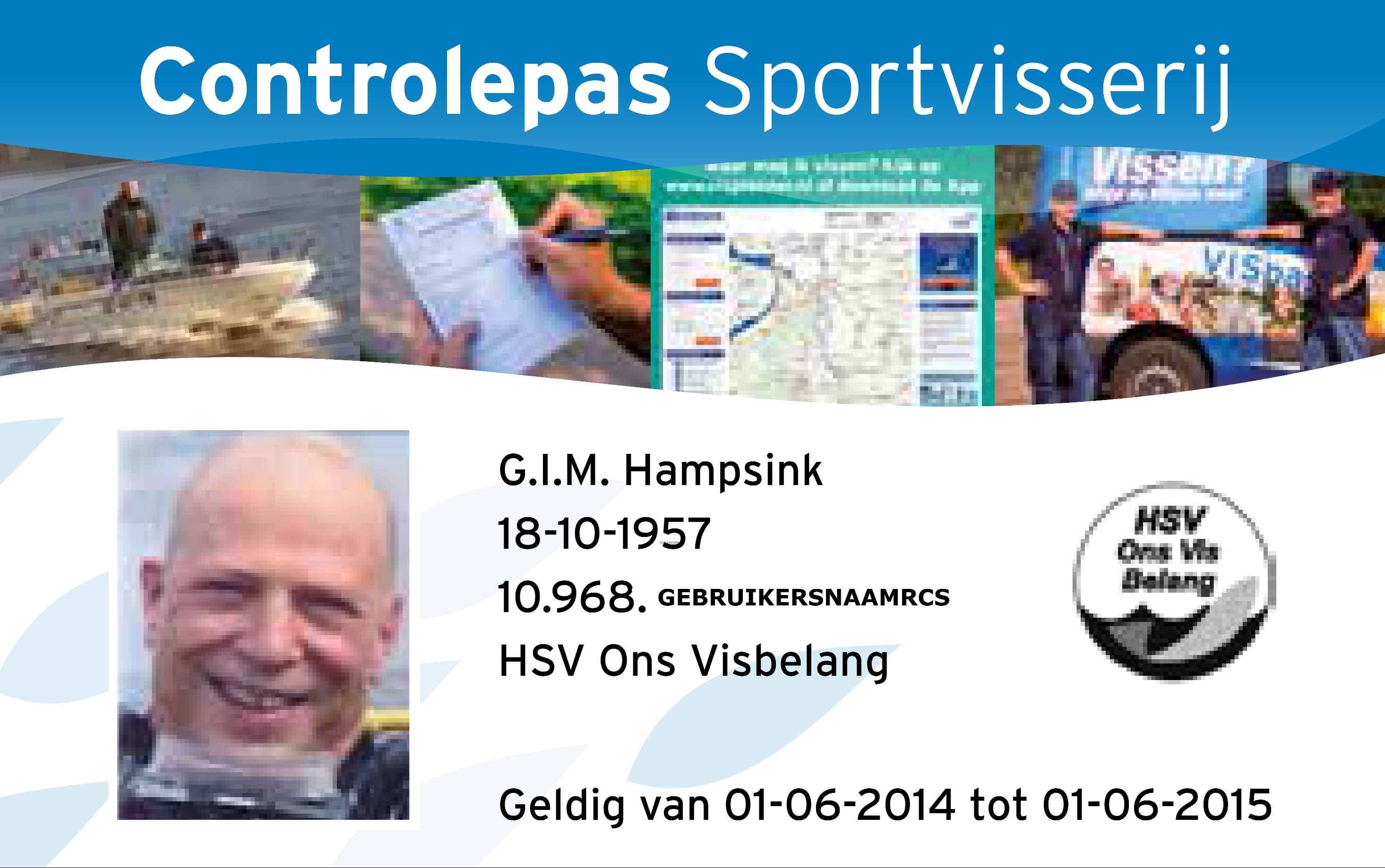De Controlepas Sportvisserij heeft creditcardformaat en hetzelfde materiaal als de VISpas. Op de voorzijde zie je een pasfoto, geboortedatum en het registratienummer van de controleur. Het laatste nummerblok vormt de gebruikersnaam voor toegang tot het Registratiesysteem voor Controleurs Sportvisserij (RCS).