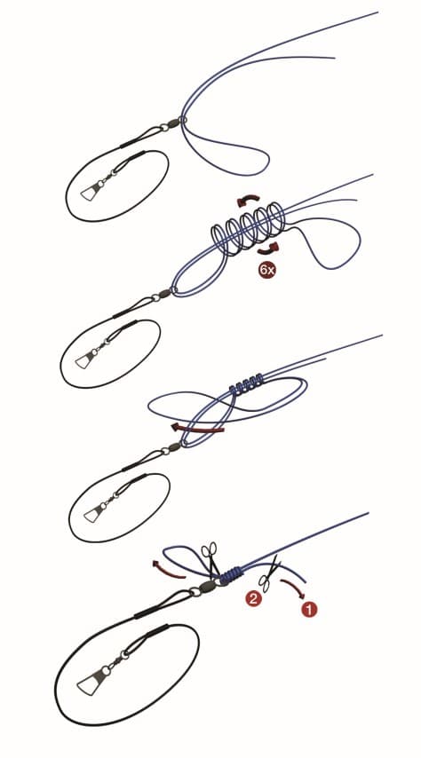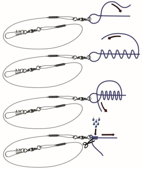 - Trek de hele knoop richting de wartel stevig aan. De stalen onderlijn zit nu vast.