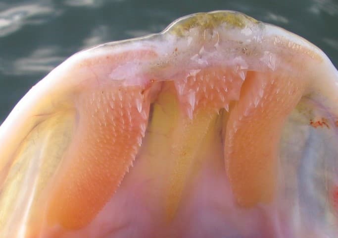 Je ziet hier honderden scherpe tanden. Dit toont meteen waarom je stevige onderlijnen gebruikt. Steek ook nooit je hand in de bek.