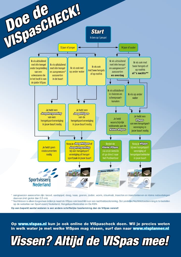 Met de VISpas mag je met twee hengels en alle toegestane aassoorten vissen in alle wateren die in de Gezamenlijke Lijst van Nederlandse Viswateren staan (voorheen wateren Grote Vergunning). In die lijst vind je wateren die verenigingen, federaties en de Sportvisunie hebben ingebracht. Het zijn er meer dan je in een vissersleven kunt bezoeken.