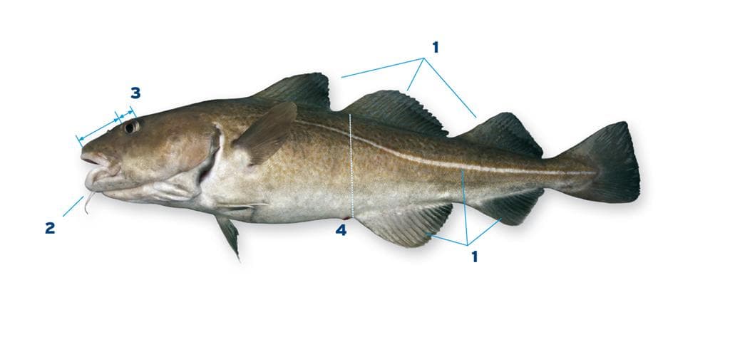 - For cod you may have a maximum of 25 fish or a maximum of 20 kg in possession. You may not fillet cod or remove the head. That makes it impossible to determine the length.