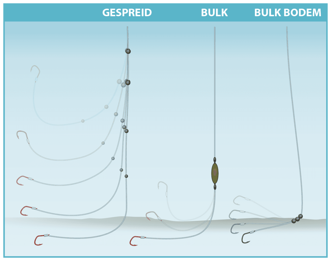 • Langere onderlijn (50 cm+) geeft trager zinkend aas maar minder beetregistratie.