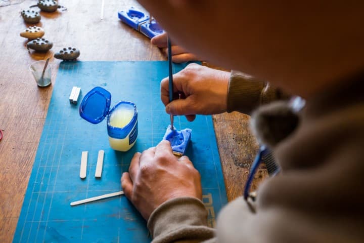 Vet beide delen van de mal grondig in met vaseline met behulp van een kwastje, zodat het gewicht op het eind , na het uitharden , makkelijk loskomt en niet in de mal blijft plakken. Zo blijft de gietvorm ook langer heel.