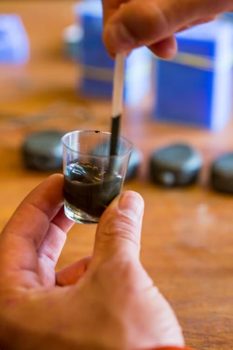 Meng de epoxy, de harder en een paar druppels autolak in een bekertje met behulp van een roerstaafje.