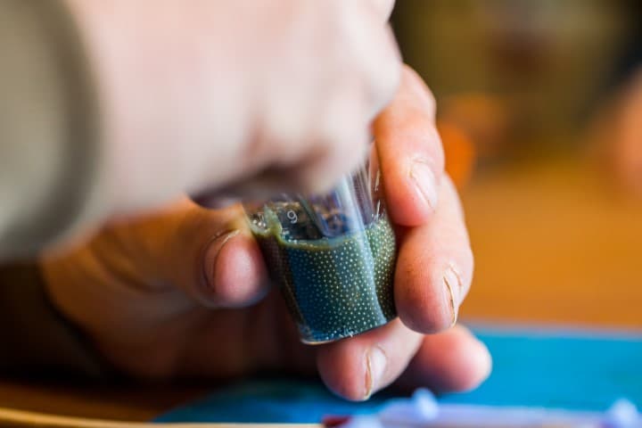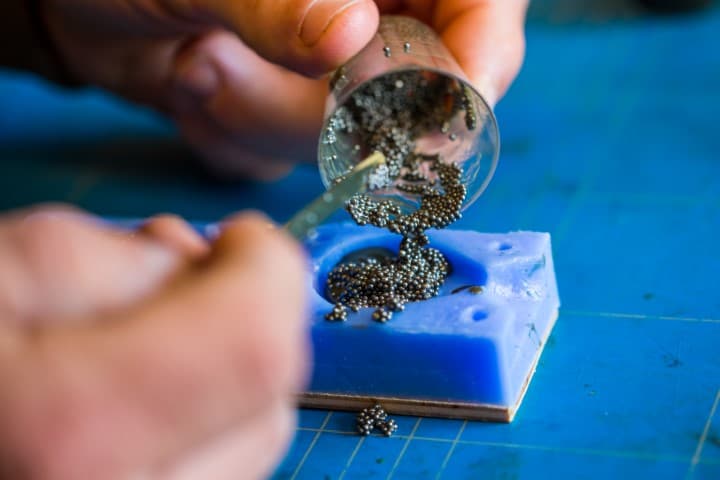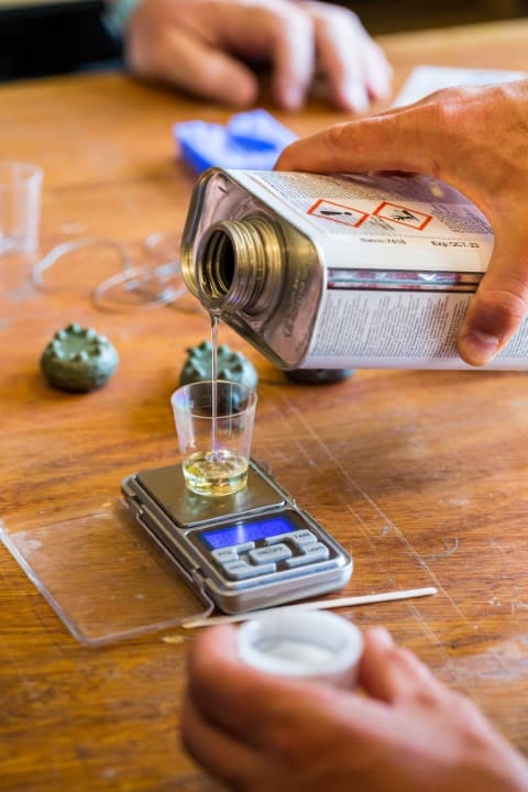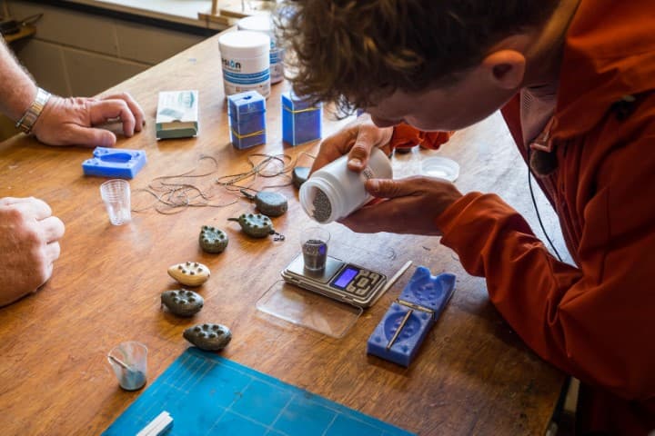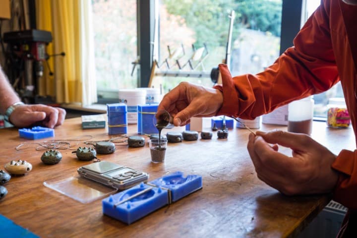 Weeg in een klein bekertje de juiste hoeveelheid kogeltjes af. De gewichten die Gerrit maakt variëren van 30 tot 180 gram. Bedenk dat het totaalgewicht een optelsom is van de kogeltjes én de epoxy, dus weeg die laatstgenoemde ook zorgvuldig af.