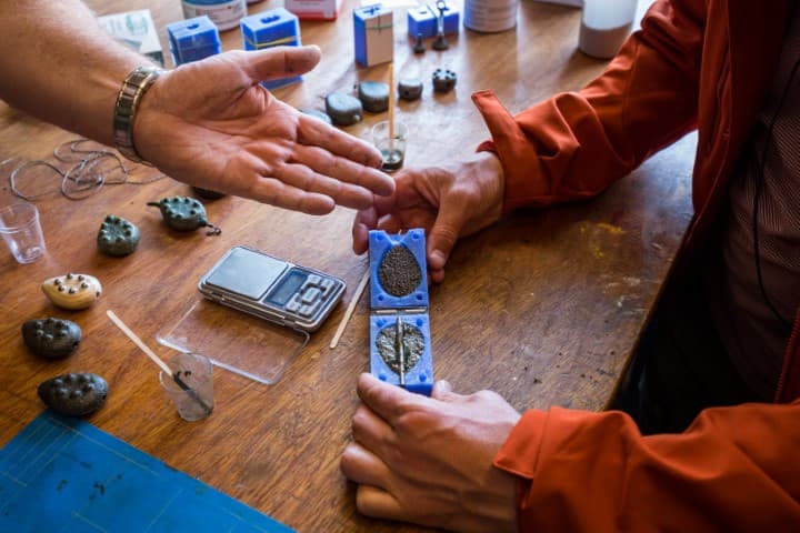 Giet een piepklein beetje epoxymengsel in de mal zodat alle uitsteeksels van de gietvorm zijn gevuld. Vul de mal vervolgens tot de rand aan met het mengsel van de epoxy en de kogeltjes. Druk beide delen van de mal snel op elkaar met het pinnetje voor de lijnopening ertussen. Omdat het pinnetje een vaste diameter heeft passen zowel Gerrit’s wartel- als inline-systemen op de gewichten. Op www.loodvrijkarpervissen.nl vind je er voorbeelden van.