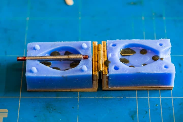 Span elastiekjes om de mal zodat hij dichtgeklemd blijft, zet hem rechtop en giet het resterende epoxymengsel er van boven in zodat alle lucht eruit is. Laat de vorm een paar uur uitharden. Afhankelijk van de gekozen epoxy bedraagt dit meestal twee of vijf uur. Open de mal, haal het gewicht eruit en verwijder met een mesje de harde epoxybraampjes. Sla tot slot met een hamertje het pinnetje eruit.