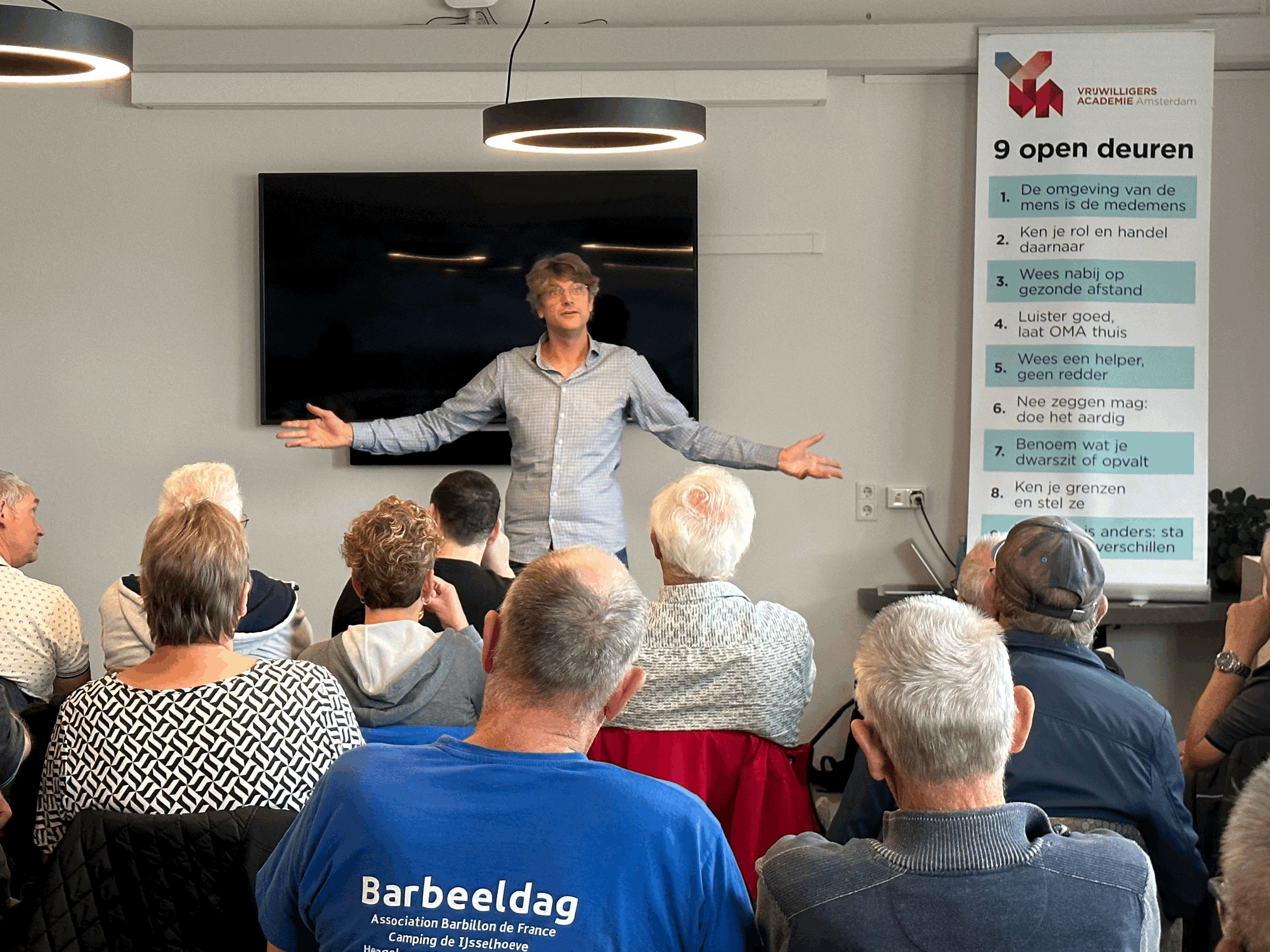 Jaap Vriend van de Vrijwilligersacademie Amsterdam nam de coaches mee in een bijna anderhalf durend theatercollege langs de ‘9 open deuren van communicatie’. Tijdens dit interactieve, leerzame maar vooral leuke college met daarin veel persoonlijk lief en leed, nam Jaap de groep mee langs negen open deuren, die “alleen nog even ingetrapt hoeven te worden”. Ze staan symbool voor 9 communicatielessen zoals grenzen stellen, nee zeggen (nee!) en luisteren (wat zeg je?), die overal uitstekend van pas kunnen komen.