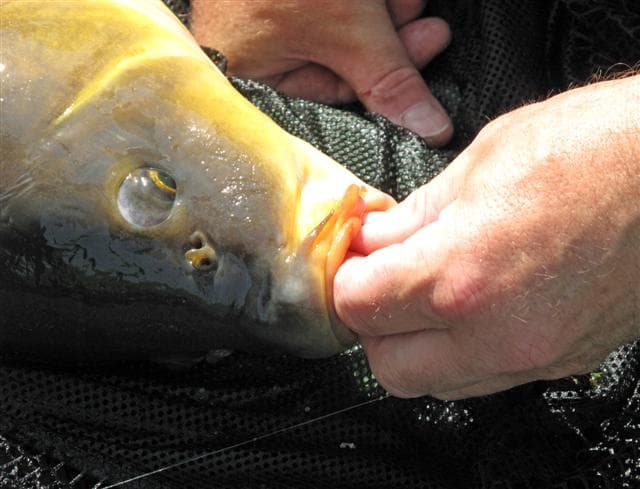 Zet de karper pas terug als hij volledig hersteld zwemt en je zeker weet dat hij weer kan wegzwemmen.