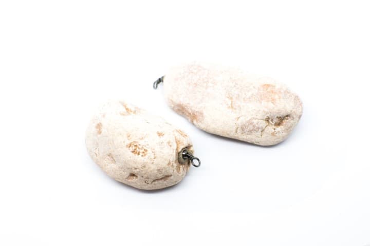 Het Juiste Vislood , Betonnen gewichten met en zonder ribbels ('gripper'). 40 tot 150 gram.