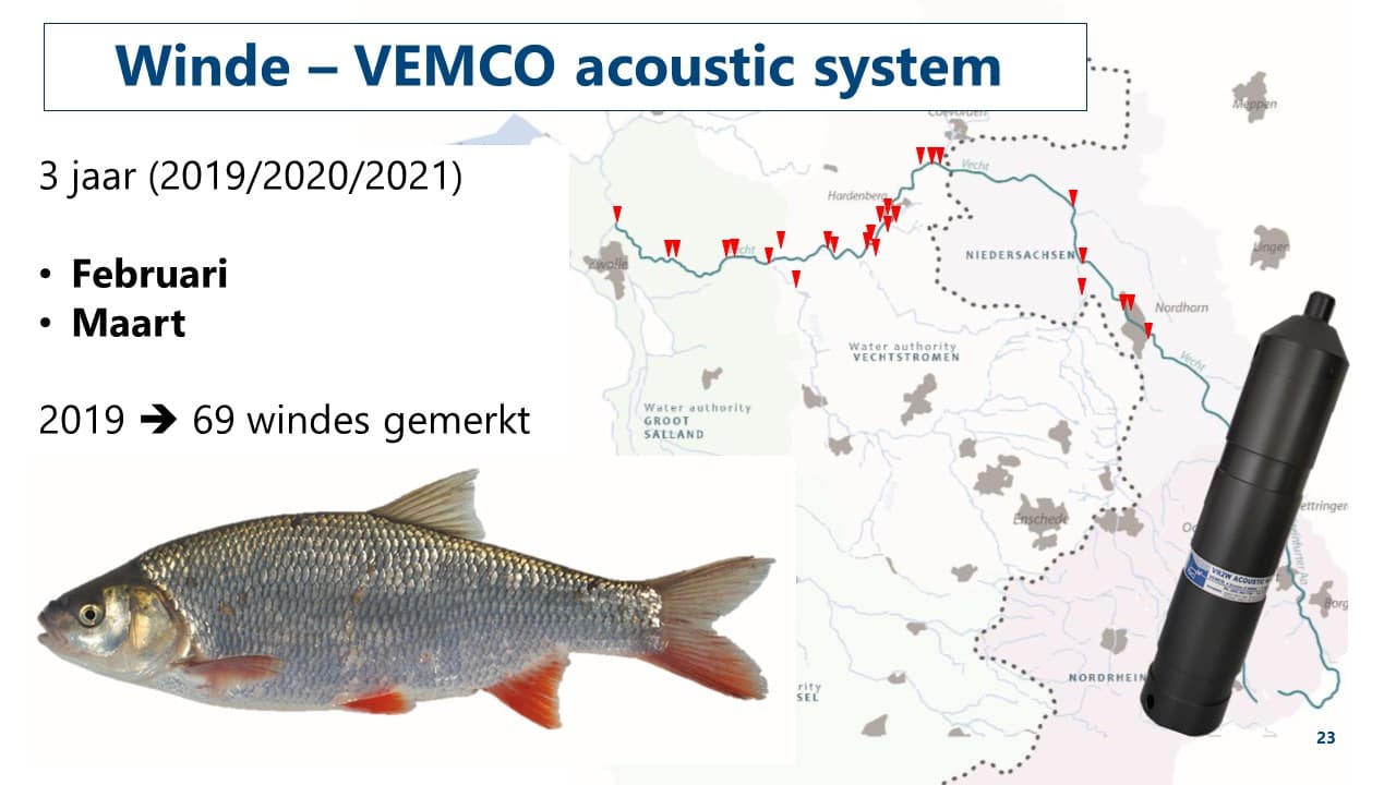 Voor het visserijkundig onderzoek vingen onderzoekers vissen met netten en de hengel. Bij vijf soorten plaatsten ze operatief kleine zenders in de buikholte: winde, kwabaal, (schier)aal, houting en Atlantische (zee)forel.