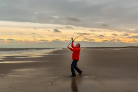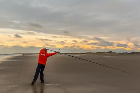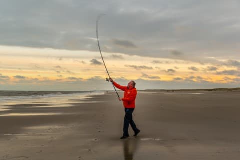 Buig alleen de elleboog van je onderste arm. De andere arm blijft gestrekt. Kijk naar het werpgewicht tijdens de vlucht. Als je krachtig werpt en de lijn op het juiste moment loslaat, haal je makkelijk 100 meter.