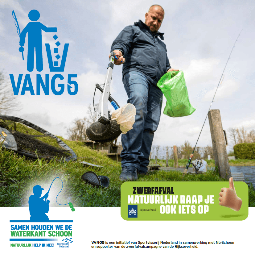 Daarom heeft Sportvisserij Nederland een paar jaar geleden de campagne ‘Vang 5’ gelanceerd. Daarin moedigen we sportvissers aan om tijdens het vissen vijf stuks afval (of 5 minuten) op te ruimen in en rond het water. Dat is een kleine moeite, maar een groot plezier. Het heeft ook een enorme impact: als elke sportvisser dit één keer per jaar doet scheelt dat maar liefst 10 miljoen stuks afval.