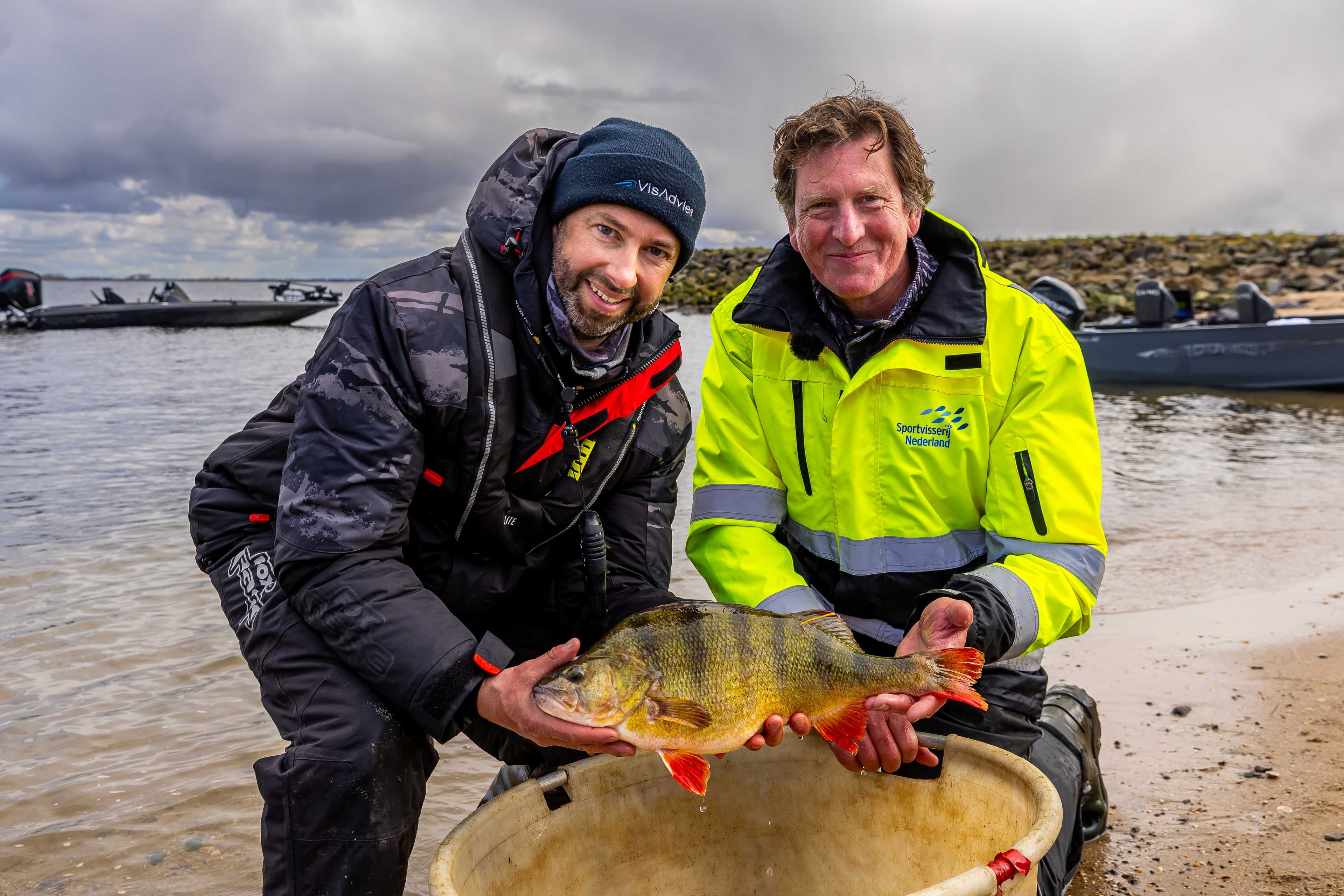Onderzoekers NIels Brevë en Hendry Vis met een grote baars die op het punt staat te worden uitgezet.