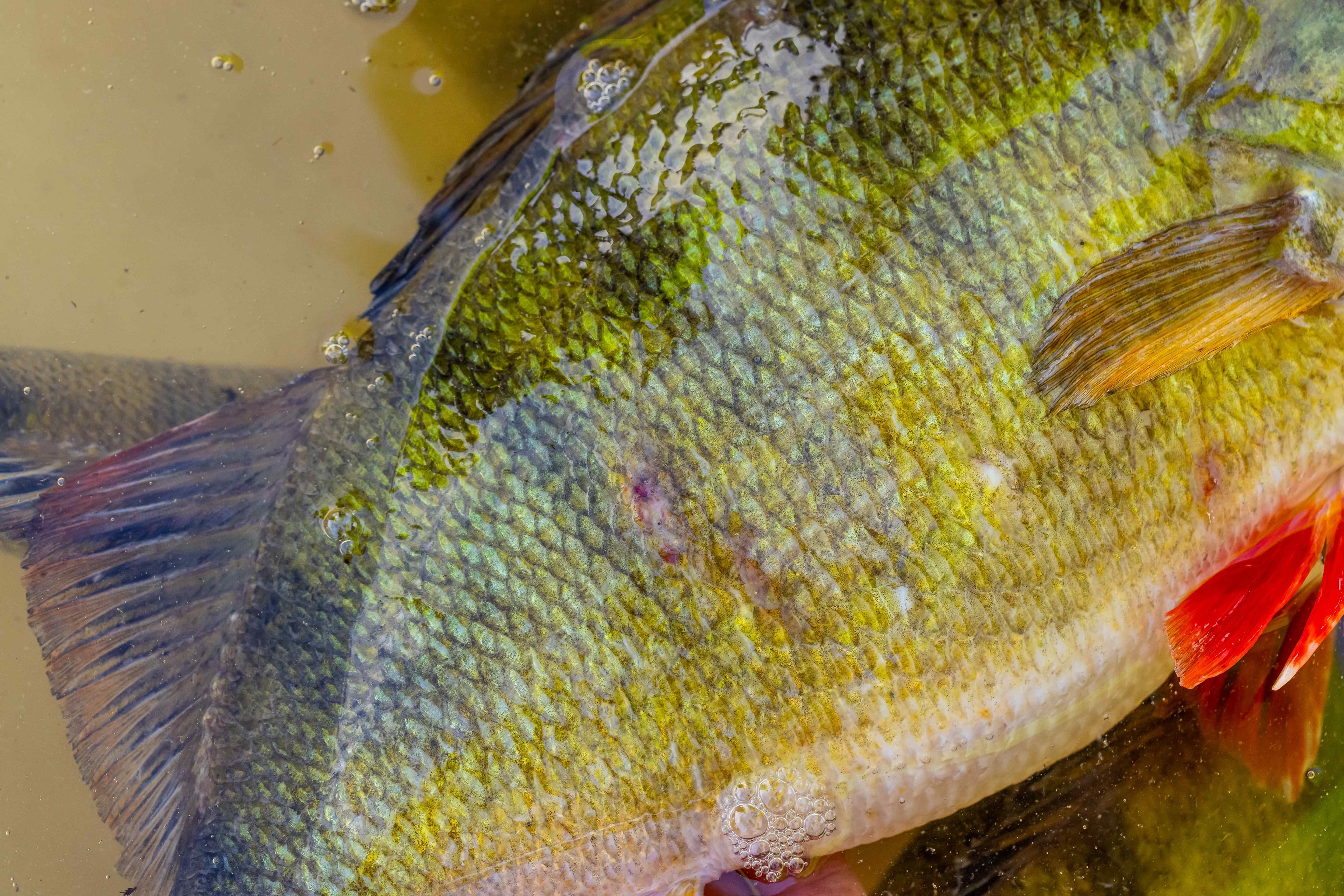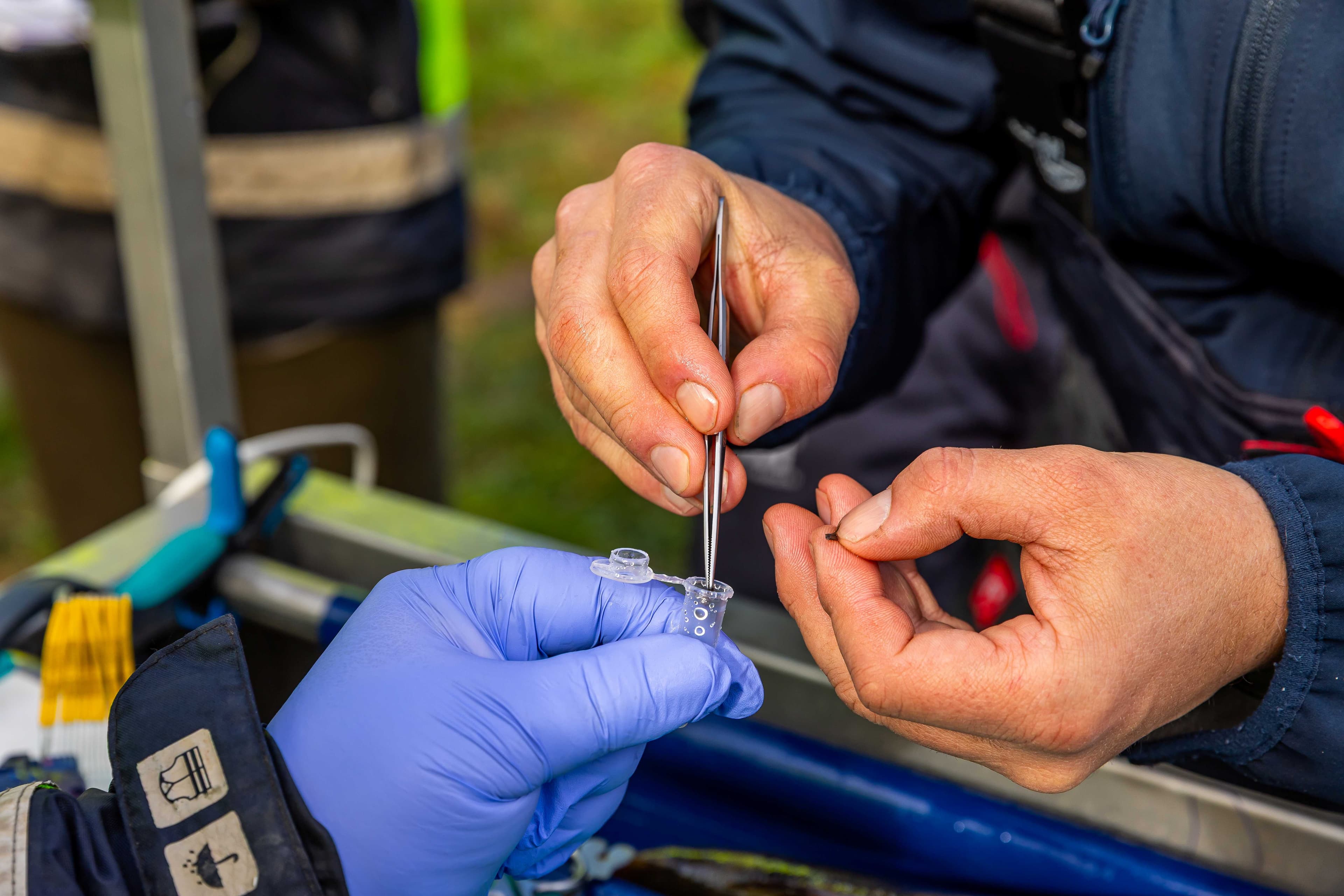 Van de baarzen wordt een klein beetje weefsel afgenomen voor genetisch onderzoek.