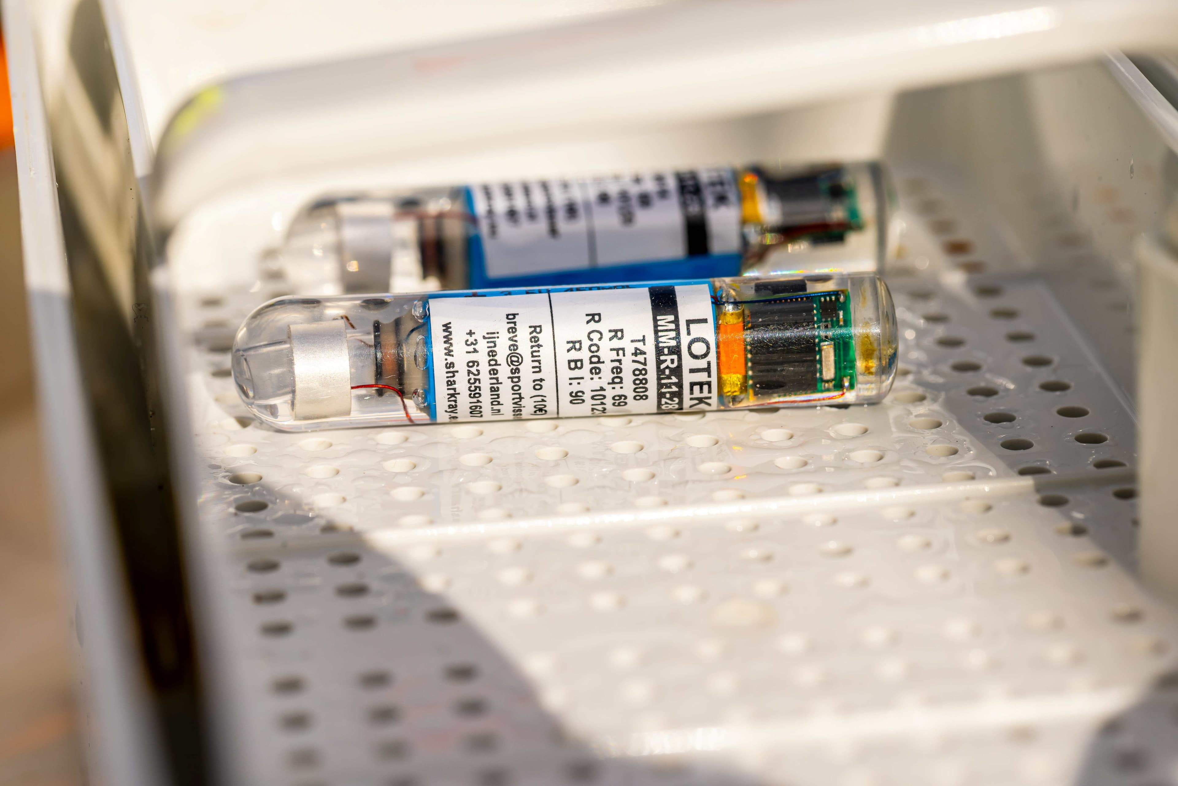 Bij de oever deden we ze in een bewaarnet dat we terug op diepte brachten om de dieren vervolgens gedurende de nacht langzaam naar de oppervlakte te brengen, zodat ze konden wennen aan de lagere druk. De dag erna opereerden we ze en lieten we ze weer vrij met in hun buik een akoestische transponder. Onder de tweede rugvin kreeg elke vis ook een felgeel extern merkje (een zogenoemde ‘floy-tag’). Twee exemplaren met de beschreven plekken stuurden we op naar het lab van Wageningen Bioveterinary Research in Lelystad om ze te onderzoeken op alle mogelijke ziektes, virussen en parasieten.”